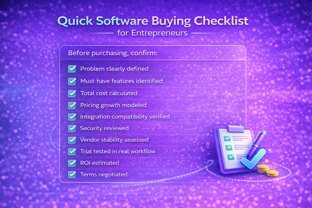 This guide provides a structured software buying checklist for entrepreneurs to prevent costly mistakes and improve ROI on every software investment.