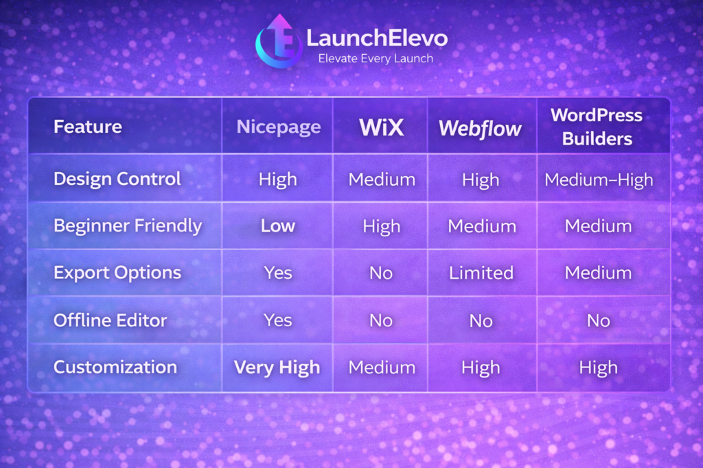 | Feature | Nicepage | Wix | Webflow | WordPress Builders |